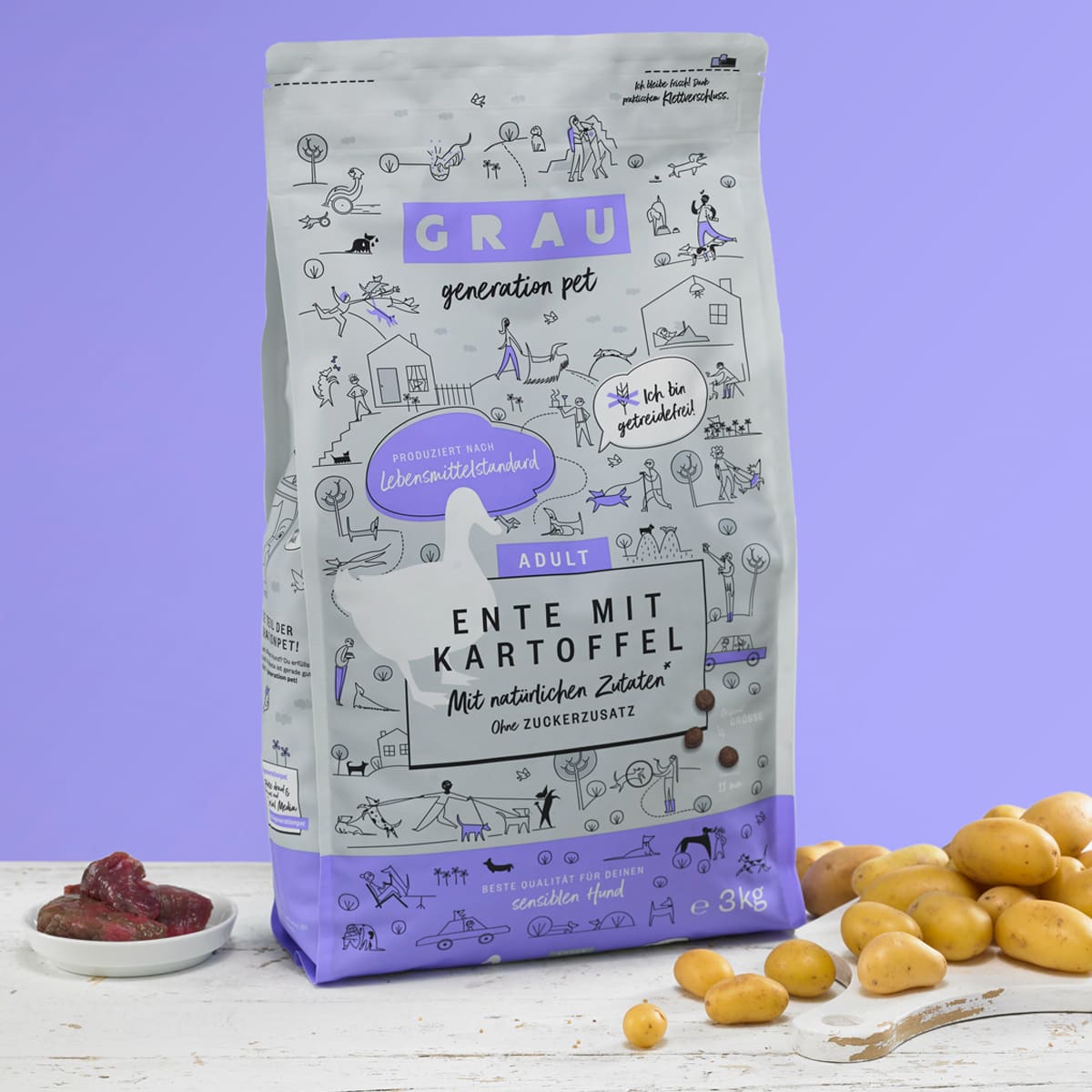 | Composition | Pommes de terre séchées (44%), protéine de canard séchée (28%), graisse de volaille, pulpe de betterave déshydratée, protéine de pomme de terre (3,1%), hydrolysat de protéine, graines de lin, pomme (séchée), chicorée (séchée), huile de poisson, minéraux, levure (séchée), huile de chardon |